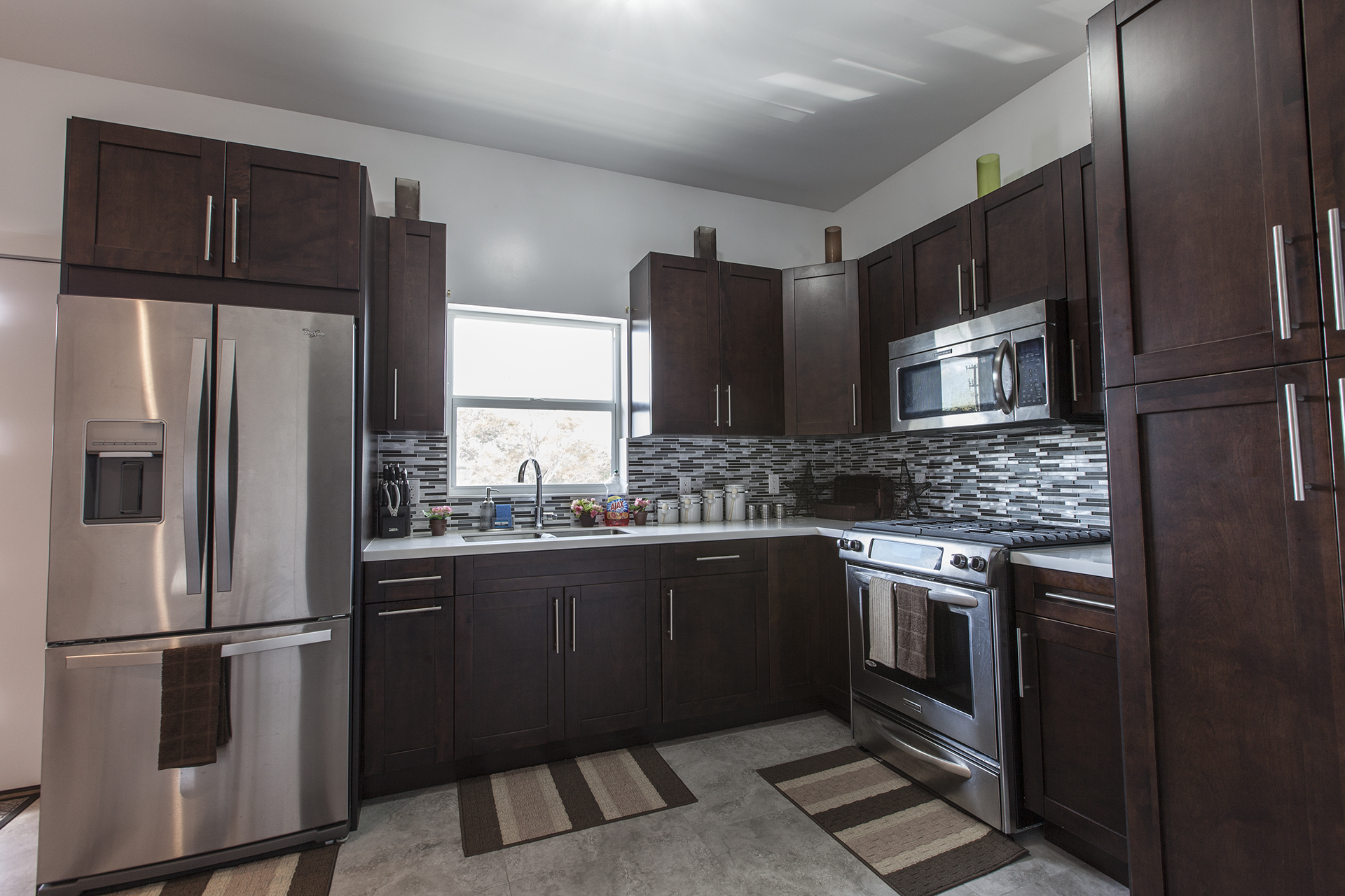 The kitchens are large attractive and completely functional with a washer and gas dyer nicely stoves away in a pantry like section of the cabinetry. Counter tops are plain white Corian.